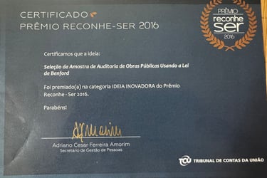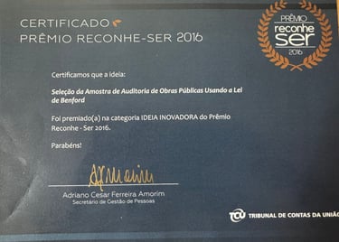 In 2016, the author received the Reconhe-Ser Award from the Federal Court of Accounts (TCU) in the category “Innovative Idea.” The program, launched in 2009 by the TCU, publicly recognizes permanent staff members who, individually or in teams, make significant contributions to their units and to the institution, aiming to achieve strategic objectives and enhance institutional results. The Reconhe-Ser Award is one of the Court’s key recognition initiatives. Staff members submit projects carried out in the twelve months prior to the application period or present new ideas. The awards are organized into three categories: innovative projects (in external control or in governance and management), outstanding projects (in external control or in governance and management), and innovative ideas. The Reconhe-Ser Award represents the appreciation and recognition of the innovative and proactive spirit of the technical staff who, in the face of the complex mission of operating and supporting external control, deliver results that have a direct impact on citizens’ lives and on the improvement of public management.