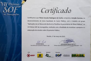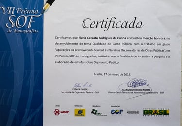 She received an Honorable Mention in the 7th SOF Monograph Award (March 2015), promoted by the Federal Budget Secretariat (SOF) in partnership with the National School of Public Administration (Enap), in the category “Quality of Public Spending.” The award aims to stimulate studies on public budgeting, recognizing works of quality and applicability in Public Administration. The award covers different editions and categories, such as “Articles” and “Solutions in Budget Data,” and grants recognition to works that address topics related to public budgeting, including planning, integrated management, fiscal rules, among others. The award was granted to the author and her master’s supervisor, Professor Maurício Bugarin, in recognition of the author’s master’s dissertation on the innovative application of Benford’s Law to budget spreadsheets of public works projects.