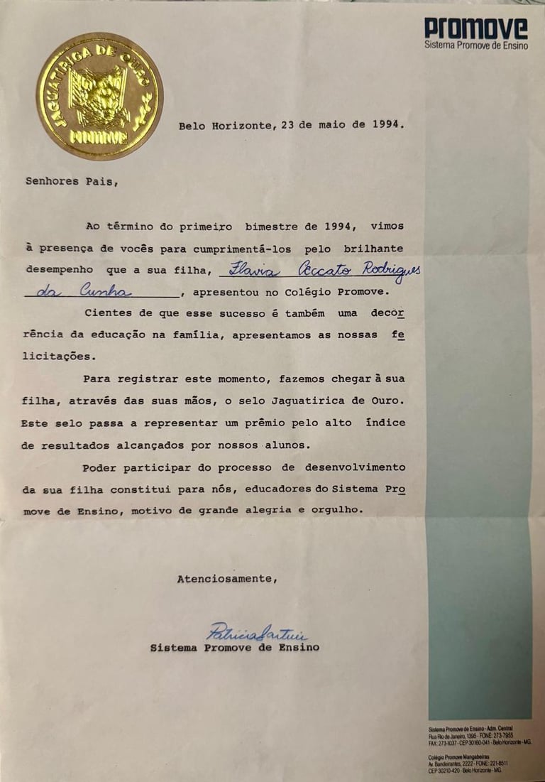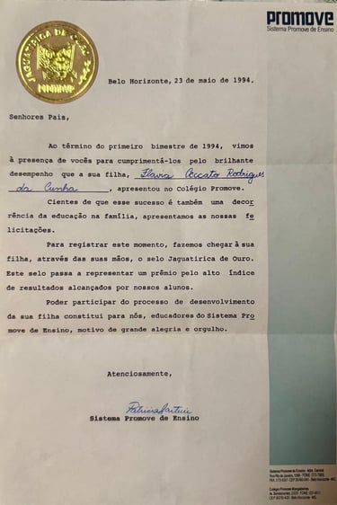 At the end of the first bimester of 1994, we are pleased to contact you to congratulate you on the outstanding academic performance your daughter, Flávia Ceccato Rodrigues da Cunha, demonstrated at Colégio Promove.