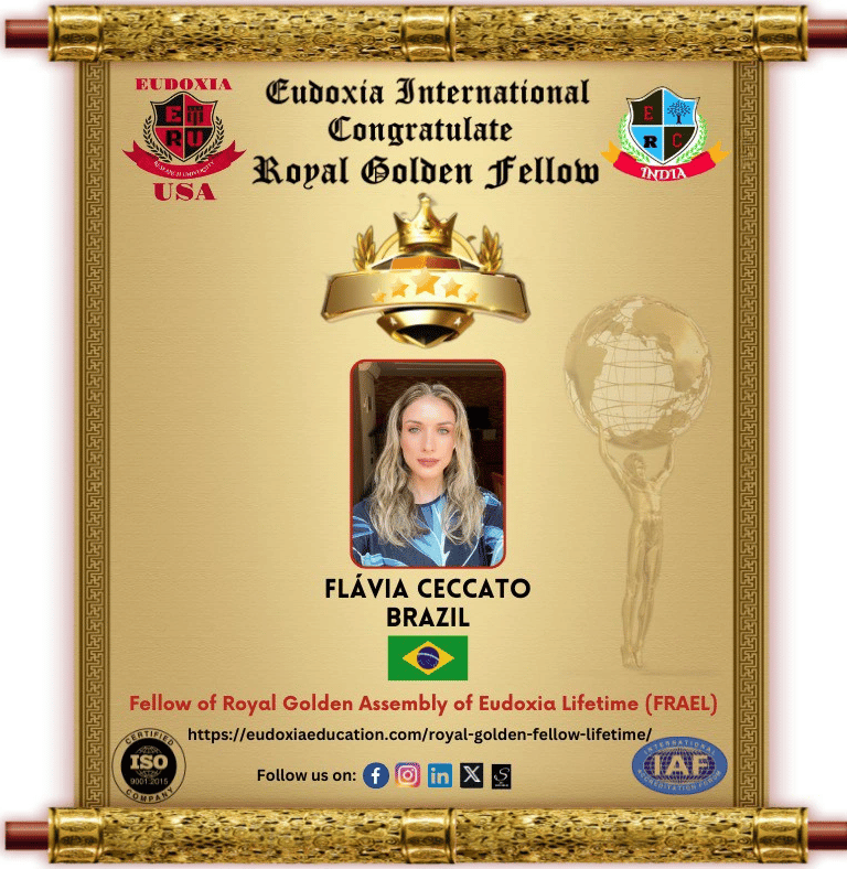 Flavia Ceccato received the prestigious Royal Golden Award from Eudoxia Research University in August 2025, recognizing her leadership, innovation, and contributions to education, research, and societal development, often tied to her work in science communication and her book on existential intelligence. This award, also known as the Golden Fellow Award, signifies her status as a Fellow of the Royal Golden Assembly of Eudoxia Lifetime (FRAEL) and grants her access to global academic platforms, publications, and conferences.